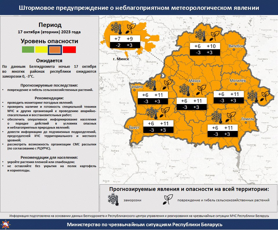 The Ministry of Emergency Situations announced an orange alert level in all Belarusian regions for October 17 and warned of an “adverse meteorological phenomenon” — frost. But, judging by the forecast for the next 3 days, there is not only frost in store for Belarusians, writes telegraf.news.