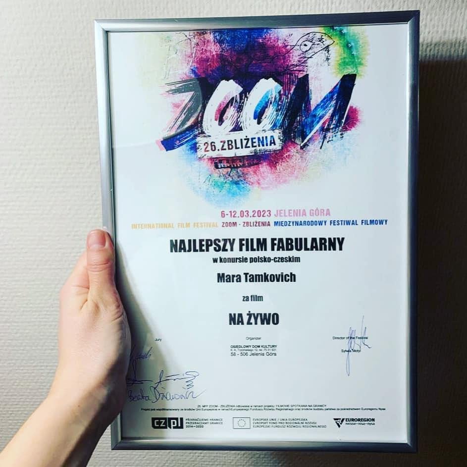 On March 12, the director of the short feature film Mara Tamkovitch announced on her Facebook that she had won at the 26th ZOOM-ZBLIŻIENIA International Film Festival in Zielona Góra. "Live" was awarded the first prize for best feature film.