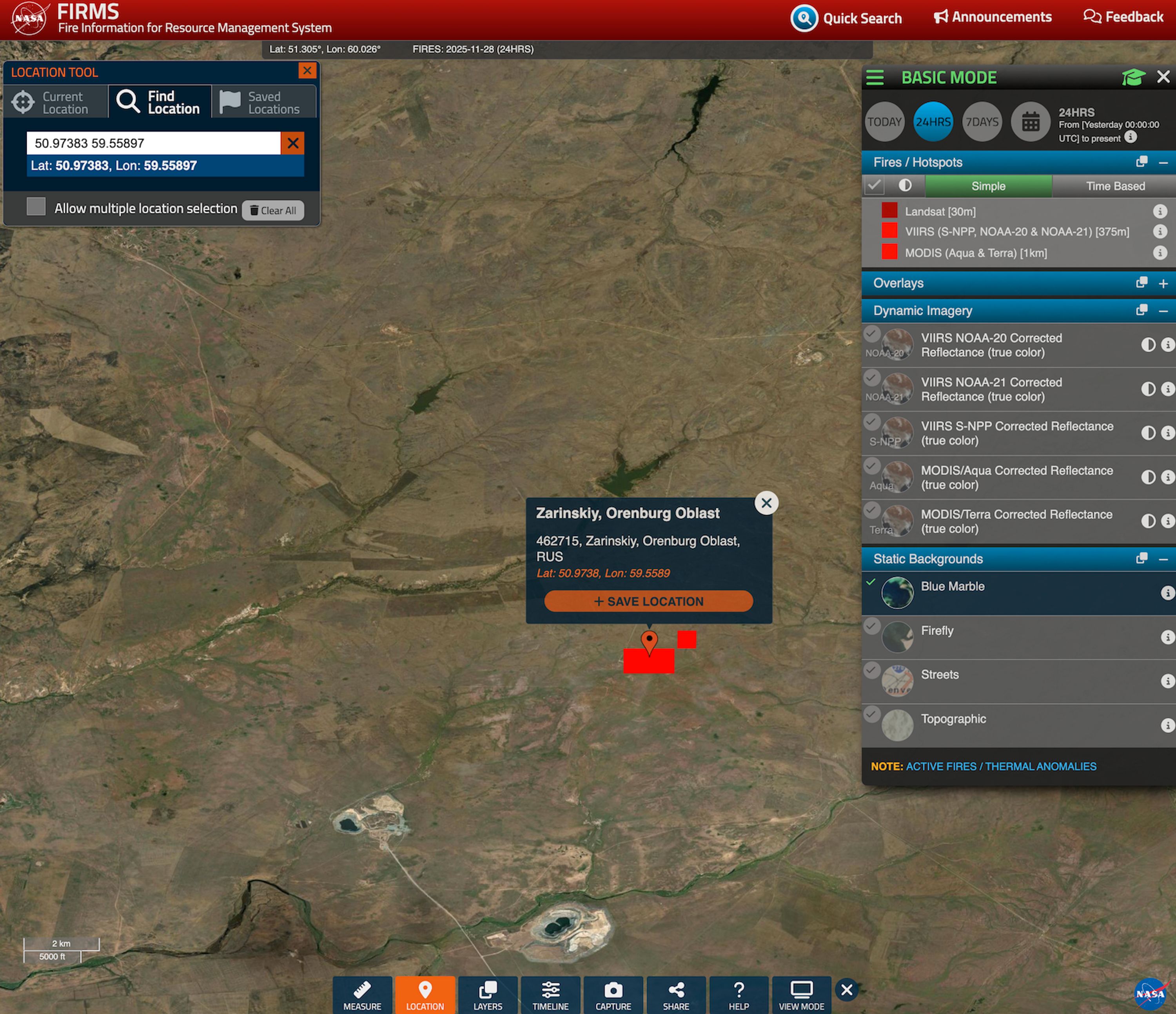 The NASA FIRMS fire mapping service shows a fire near the test site.