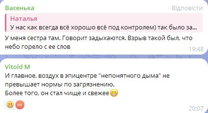 The local publication "Ural56.ru" with reference to the residents of Yasnoye reported about "cotton" and "incomprehensible smoke". Later, the same publication stated that according to the Unified Duty Dispatch Service of the Russian Federation, the residents of Yasnoye will not be evacuated because of the incomprehensible smoke, because "there is no threat to the population, the maximum permissible concentration is normal."