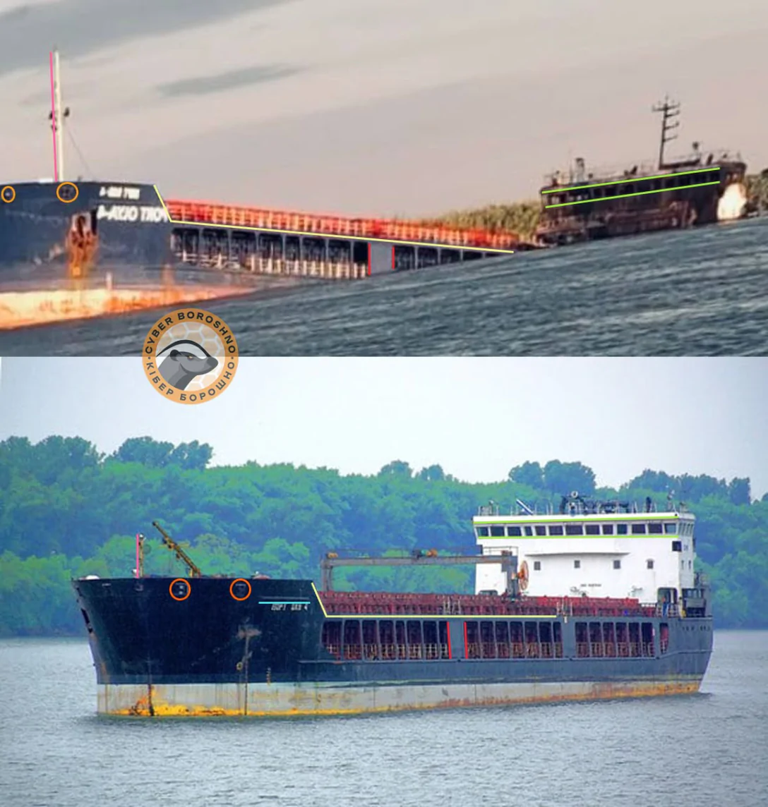 In the meantime, the Telegram channel of OSINTers Cyberborosno found a photo of the dry cargo ship "Port Olya 4" before and after the events of August 15. Analysts noticed two characteristic dots on the sides and assured that it seems to be the one in question.