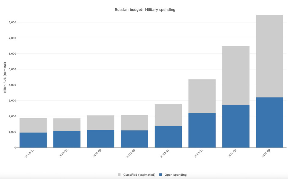 Russia's military budget expenditures in the first half of 2025 set a new absolute record - 8.484 trillion rubles, a researcher at the German Institute for International Security Affairs Janis Kluge has calculated on the basis of data from the Ministry of Finance.