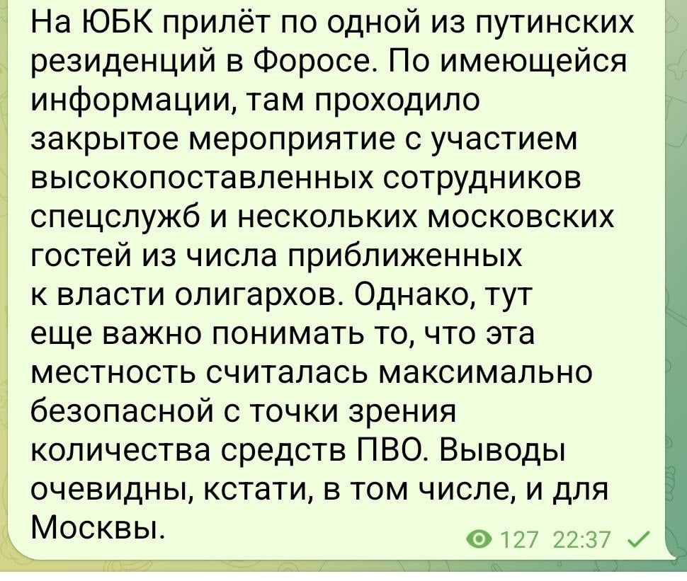Returning to Foros and the attack on this facility, there is one important nuance. According to the Russian media, on Sunday a certain closed event was to be held in the restaurant of this sanatorium, and the institution's website stated that the restaurant was closed for "special service" on September 21.