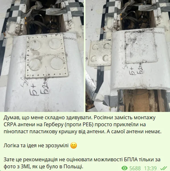 The expert noted that instead of mounting a CRPA antenna on the Gerbera designed to protect the drone from jamming by electronic warfare (EW), the Russians simply glued a plastic antenna cover onto the foam. At the same time, the antenna itself was not found on the UAV.