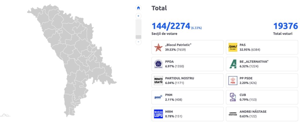 The Central Electoral Commission has presented the first preliminary results of the parliamentary election. After processing data from 144 polling stations, the Patriotic Election Bloc is in the lead with 39.53%. In second place is the Action and Solidarity Party (PAS) with 32.95%, reports newsmaker.md.