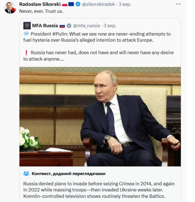 Polish Foreign Minister Radoslaw Sikorski ironically reacted to Vladimir Putin's statement that Russia allegedly "has never had and will never have intentions to attack anyone."