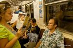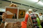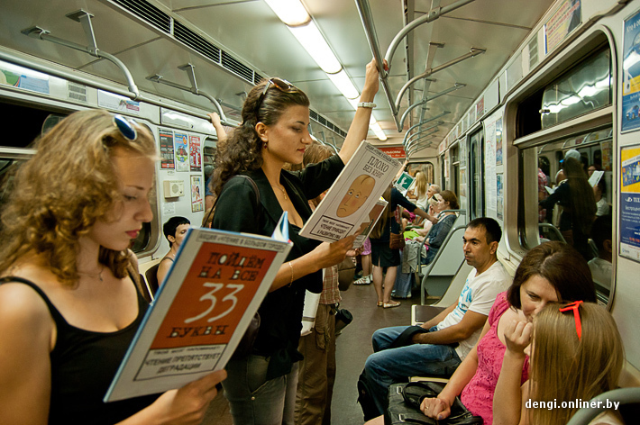 В определенный момент молодые люди достали книги и начали читать. Реакция пассажиров в вагоне была неоднозначной: некоторые уходили в другое место, другие улыбались и фотографировали участников акции, а кто-то делал вид, что «чтецов» не замечает.