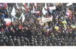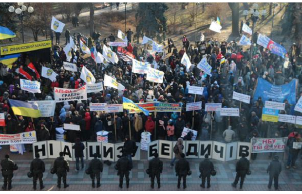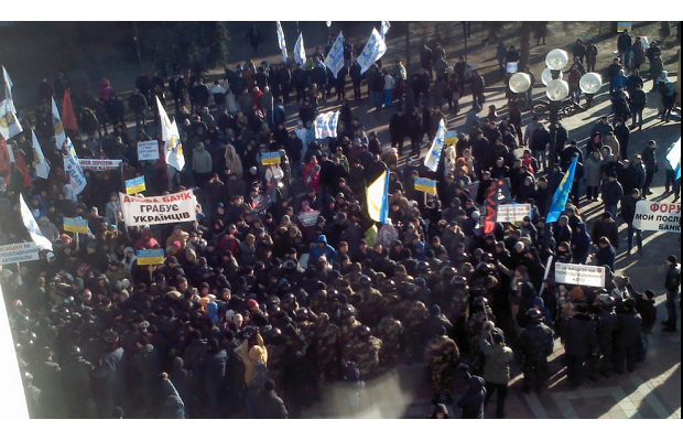 Участники «финансового майдана» возле здания парламента пытаются прорваться в здание Верховной Рады через кордон милиции.