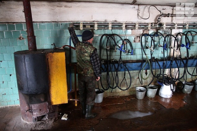 Рабочие ведут меня мимо фермы. Старые доильные аппараты и печка на дровах, чтобы греть воду. В «ленкомнате» - небольшой бытовке, где переодеваются доярки, стоит печка-буржуйка. Нас ждут семеро работников. Всего здесь работает 11 человек.