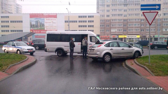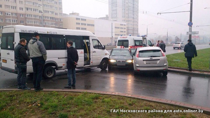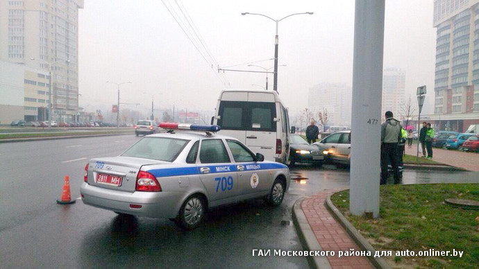 Вчера в 16:30 на проспекте Дзержинского в Минске неподалеку от перекрестка с улицей Ежи Гедройца произошло ДТП с участием двух легковых автомобилей и маршрутного такси.