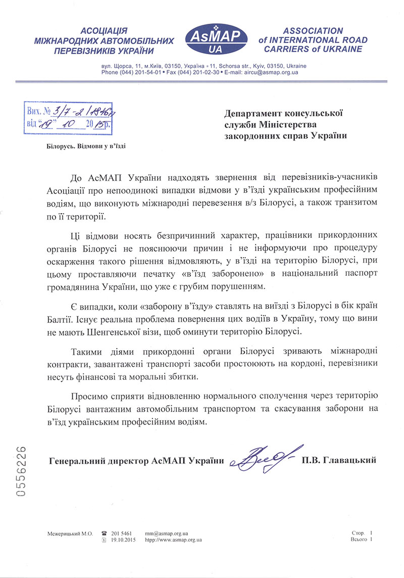 Просим повлиять на возобновление нормальных перевозок грузового транспорта через территорию Беларуси и отмены запрета украинским профессиональным водителям», - написал генеральный директор АсМАП Украины П.В. Гловацкий.