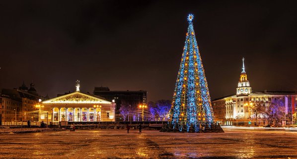 Елка на центральной площади Воронежа украшена голубой и желтой подсветкой.