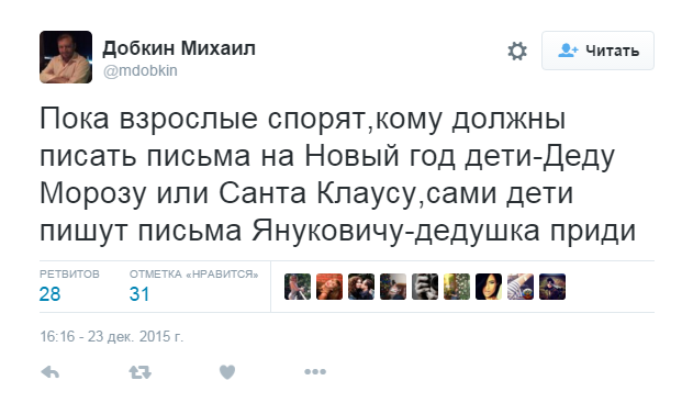 «Пока взрослые спорят, кому должны писать письма на Новый год дети — Деду Морозу или Санта Клаусу, дети пишут письма Януковичу — дедушка приди», - написал он в «Твиттере».