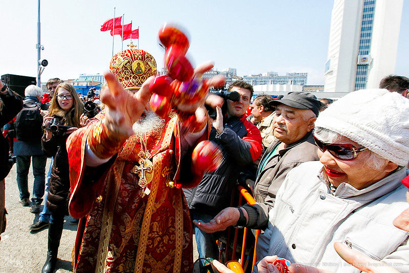 В российском Владивостоке Крестный ход, посвященный празднованию Пасхи, завершился молебнем и бросанием яиц в толпу.