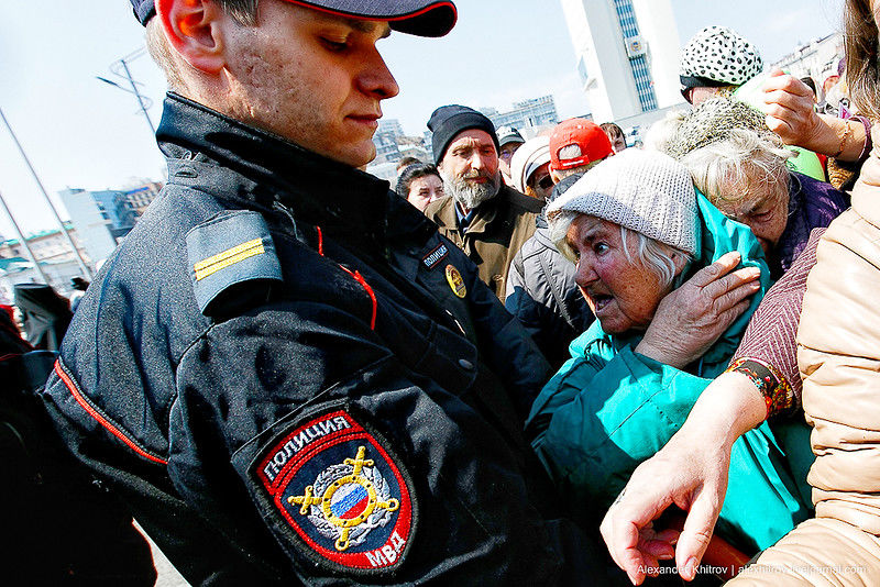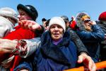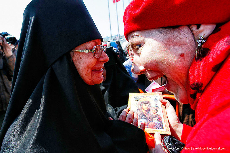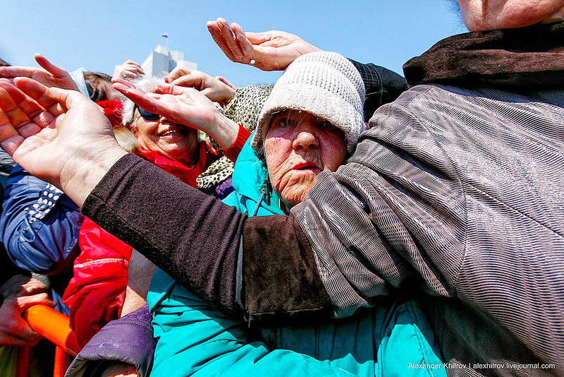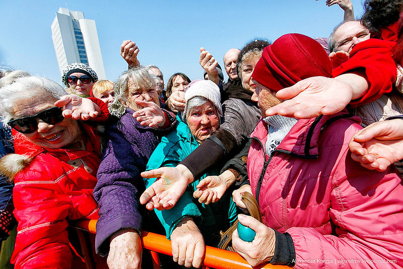 На снимках видно, как митрополит Владивостокский и Приморский Вениамин просто бросает в толпу яйца. При этом пришедшие на молебен россияне бежали их ловить.