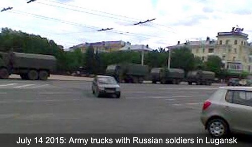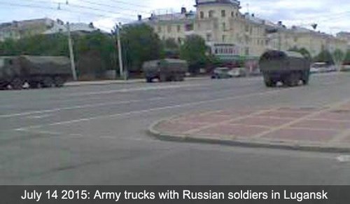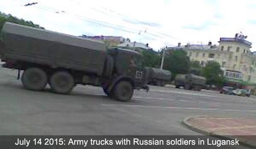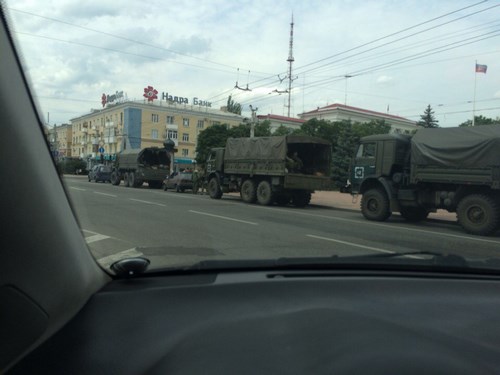 14 июля по центральной улице оккупированного Луганска проехал десяток военных тентованных грузовиков.