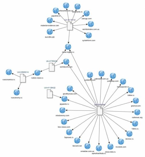 Один из сайтов, news-region.ru, был связан еще и со вторым идентификатором Google Analytics, а тот — с рядом из 19 прокремлевских сайтов, писал Александер. Дальнейшие исследования выявили еще три аккаунта Google Analytics, объединяющих другие кластеры, на основе которых журналист создал инфографику.