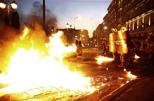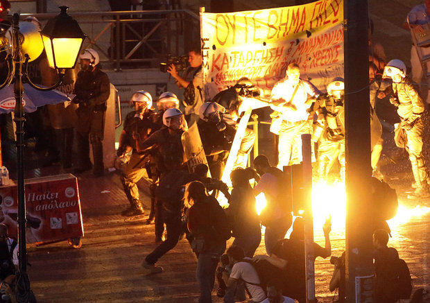 У здания парламента в центре Афина, где обсуждается судьба антикризисного соглашения, между демонстрантами и полицейскими начались столкновения, сообщает Reuters. Протестующие забросали полицейских бутылками с зажигательной смесью, те в ответ распылили слезоточивый газ и задержали порядка 50 человек.