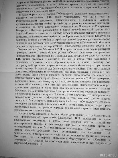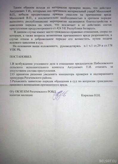 Год назад Рогачевский РОВД отказал Мосаловой возбуждать уголовное дело против председателя сельсовета, так как милиционеры не увидели в действиях последней «прямого умысла в совершении вреда Мосаловой, а исключительно необходимость в срочном порядке выполнить республиканские мероприятия, касающиеся благоустройства и наведения порядка на земле, что исключает в ее действиях состав преступления, который предусмотрен ст.424 УК РБ » – обозначенно в материалах проверки Рогачевского РОВД.