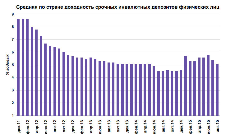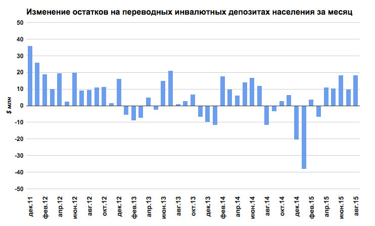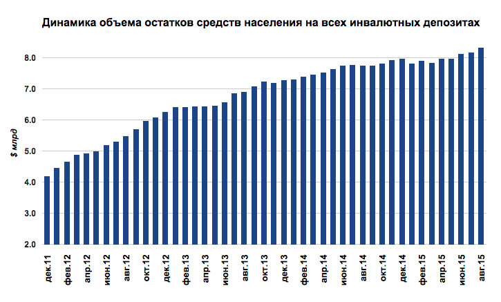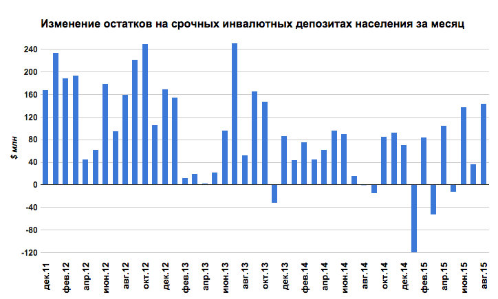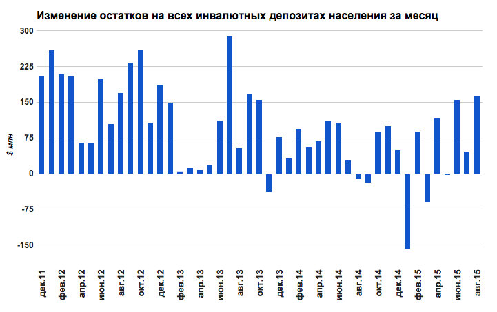 Суммарный объем остатков средств физических лиц на всех инвалютных депозитах увеличился за август на $162 млн, или на 1,9%. Это самый большой месячный прирост с сентября 2013-го.