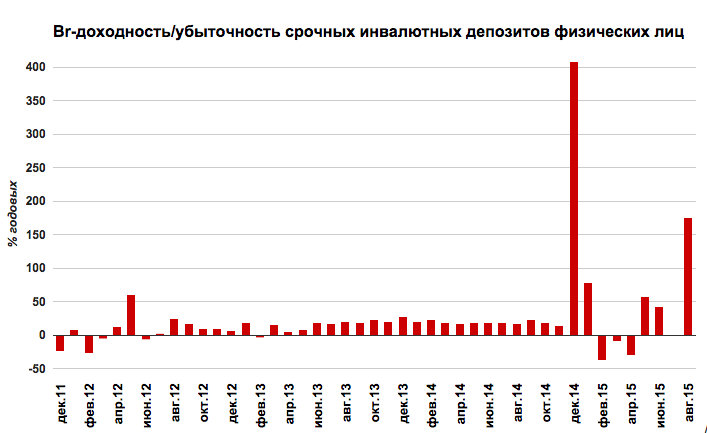 В августе к средней по стране 4,5%-ю ставке по всем срочным инвалютным депозитам прибавился 170%-й (годовых) курсовой прирост. В результате средняя в отчетном месяце Br-доходность срочных вкладов в инвалюте - 176% годовых. Это 14,9% «плюса» к телу вклада за месяц.