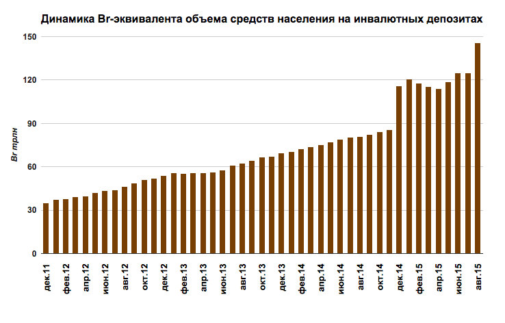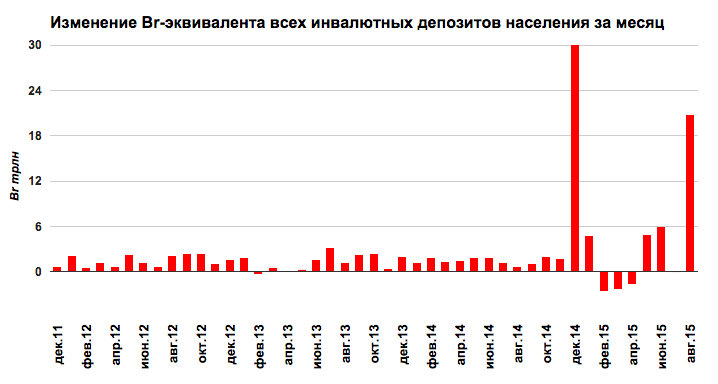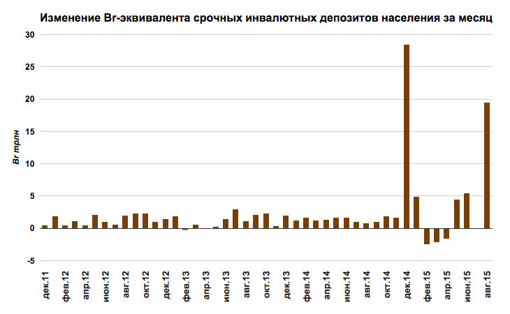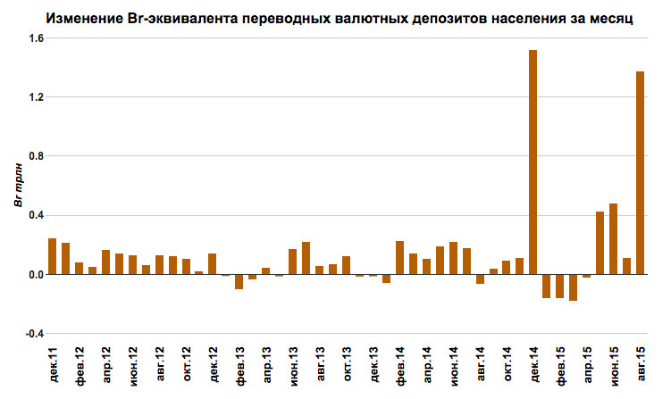 Объем рублевого эквивалента срочных валютных депозитов физических лиц вырос за август на Br19,48 трлн, до Br136,9 трлн. В декабре 2014-го было плюс Br28,52 трлн, то есть больше, чем в отчетном месяце, хотя приток непосредственно валюты от населения на срочные депозиты тогда был заметно меньше.