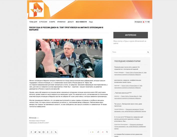 РЕН ТВ на своем сайте опубликовал новость о присутствии на митинге оппозиции в Марьино посла США в Москве Джона Теффта. Новость сопровождалась смонтированной фотографией, взятой из «Твиттера», пишет РБК.