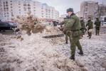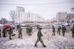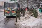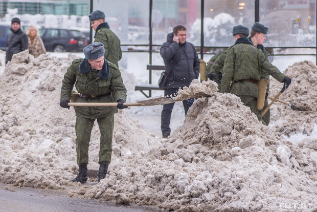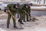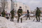 Курсанты Военной академии, вооружившись снегоуборочными лопатами, вышли в столице на борьбу со снегом.