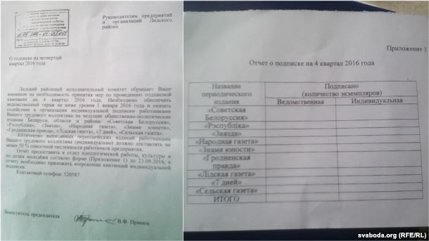 В письме, подписанном заместителем председателя райисполкома Михаилом Карповичем, обращалось внимание руководителей предприятий «на необходимость принятия мер для проведения подписной кампании на 4 квартал на издания «Советская Белоруссия», «Республика», «Звезда», «Гродненская правда», «Лидская газета» и другие ...»