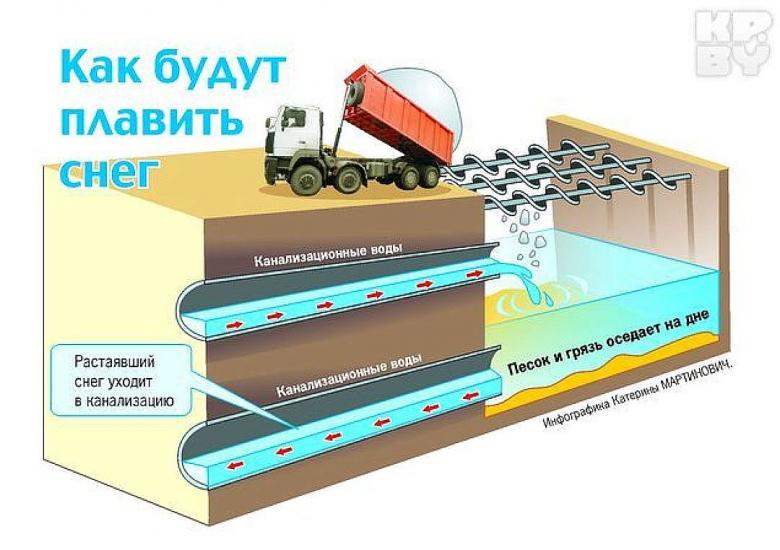 В конце 2013 года решили использовать еще один метод - пусть снег растапливают теплые канализационные воды! Смысл такой: на базе канализационных коллекторов построят специальные шахты. В них можно сбрасывать снег, который через специальные дробилки попадает в канализацию, а ее температура около +15 градусов. От этого тепла снег тает и со сточными водами течет на очистные сооружения. Это и экологичнее, и не нужны дополнительные нагреватели.