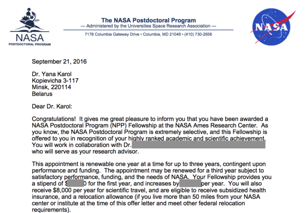 В начале письма девушку поздравляют с участием в программе, а также оговаривают ее зарплату в первый и последующий годы. Яна не раскрывает, сколько она будет получать в NASA, но говорит, что сумма в 10 раз больше ее текущего заработка в Академии наук.