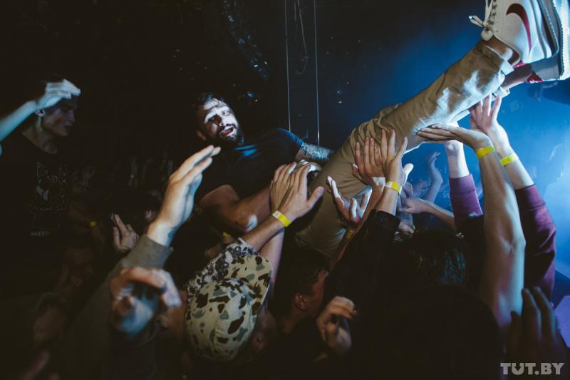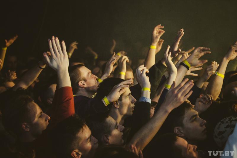 Группа начала выступать после восьми вечера. Поначалу многие люди не танцевали, а просто снимали происходящее на мобильники, однако постепенно зал раскачался. Но и масштаб мероприятия был другим. Например, если в Киеве на сцене иногда было и по 30 человек, то всю минскую программу группа провела вчетвером. Концерт длился менее часа, потому что на большее у «Грибов» пока нет песен.