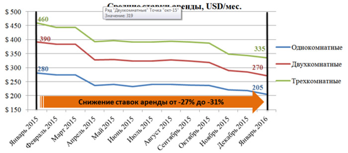 Стоимость аренды за последний год уменьшилась в среднем на 75 долларов для однокомнатных и на 120 — для двух- и трехкомнатных квартир.