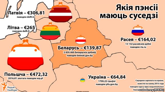 Впрочем, размер пенсий вряд ли можно назвать высоким. Конечно, на Западе пенсионеры получают под тысячу евро, а в Люксембурге - все три тысячи. Но и у близких соседей Беларуси пенсии значительно превосходя наши 140 евро (согласно информации Белстата на конец 2015 года по курсу на 31 декабря 2015 года).