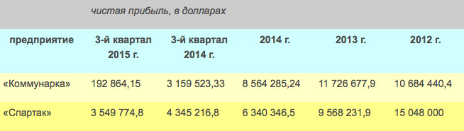 За третий квартал 2015 года (это самые свежие данные, которые опубликовало Министерство финансов) чистая прибыль СОАО «Коммунарка» составила 2 млрд 944 млн рублей или 192 864,15 доллара (средний курс доллара за январь-сентябрь 2015 года — 15 264,63 рубля).