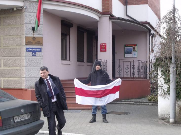 У отделения посольства Беларуси состоялось два одиночных пикета, которые провели активисты Артур Балакишиев и Михаил Фельдман.