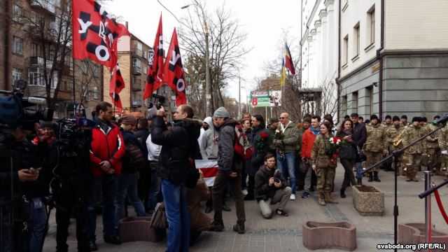 На открытии памятного знака на улице Белорусской, 22 в Киеве было около сотни человек, в том числе почетный караул и военный оркестр.