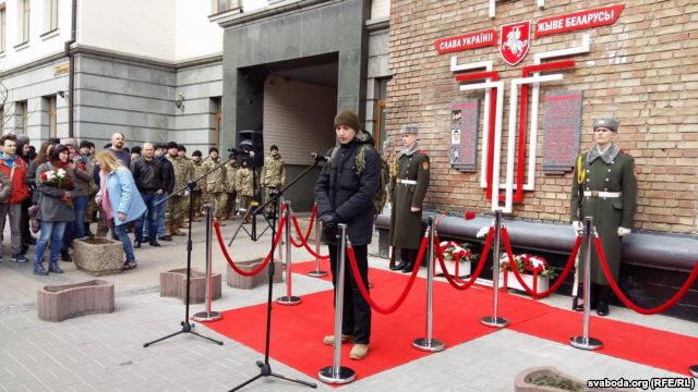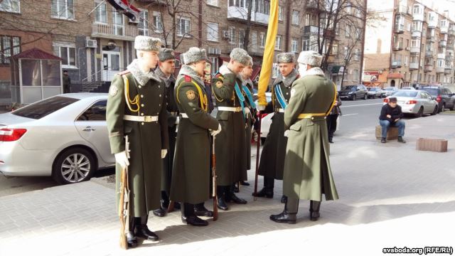 Официальная церемония началась с исполнения белорусского гимна «Магутны Божа». В ней приняли участие волонтеры, соратники белорусов, погибших на Майдане и на Донбассе, представители общественных организаций «Правый сектор» и УНА-УНСО, а также жители Киева, передает «Радыё Свабода».