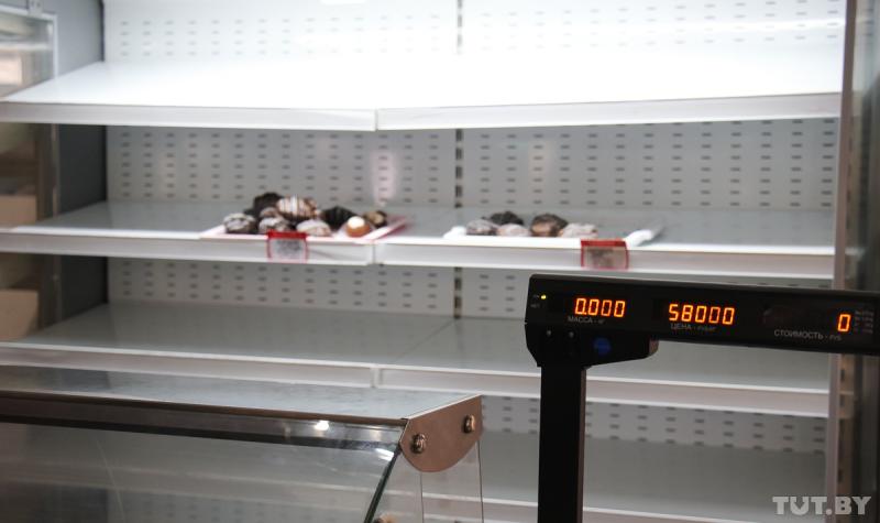 Пустые витрины, остатки конфет и пирожных, несколько одиноких тортов - это все, что осталось 31 марта от «Лакомки», какой ее запомнили минчане. Кроме минималистичных картин есть еще расстроенные покупатели и печальные продавцы, не понимающие, что делать дальше.