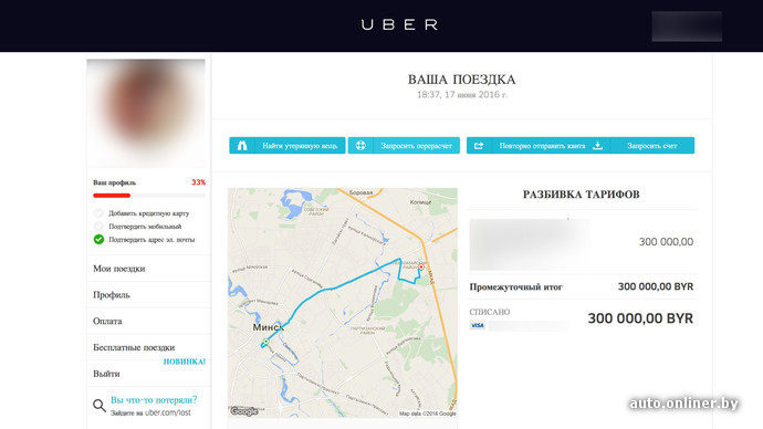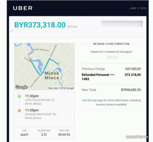 Вечером перед выходными читатель onliner.by Петр вызвал себе UberX и спокойно поехал домой. Правда, в пункте назначения спокойствие закончилось. Пришел отчет о поездке и списании денег с карточки. Поездка, которая обычно стоит не больше 80 000, обошлась в 300 000. Пассажиров вроде Петра в городе оказалось много. Uber списывал за поездки от 300 до 420 тысяч. Перевозчик объяснил, что произошло вчера, и поспешил успокоить клиентов.