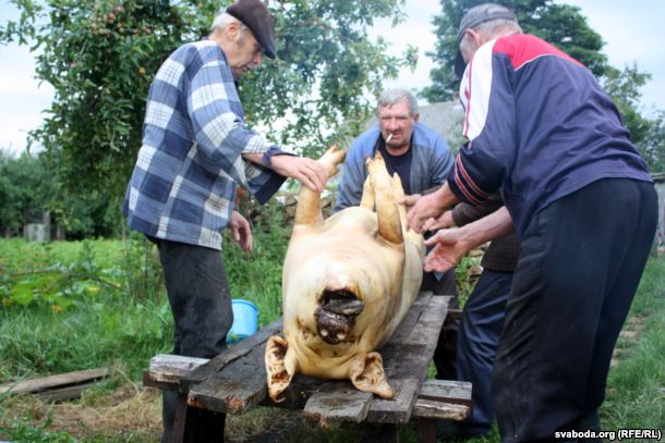 С самого утра в деревне Будча почти через двор колют свиней. Замечая журналистов, многие люди настораживаются, некоторые просят не снимать и объясняют, что у них все в порядке, свинья не больна.