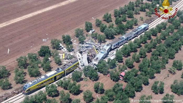 Столкновение произошло на участке между городами Руво-ди-Пулья и Корато в провинции Бари в области Апулия. По данным Reuters, поезда столкнулись посреди оливковой рощи.