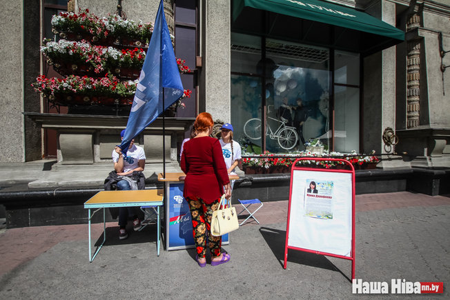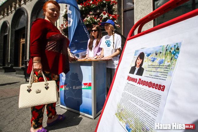 Под флагом Федерации профсоюзов Беларуси сегодня у столичного ГУМа стоит «предвыборный пикет» претендента в «депутаты парламента» Ирины Дорофеевой, сообщает nn.by.