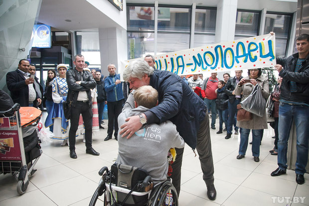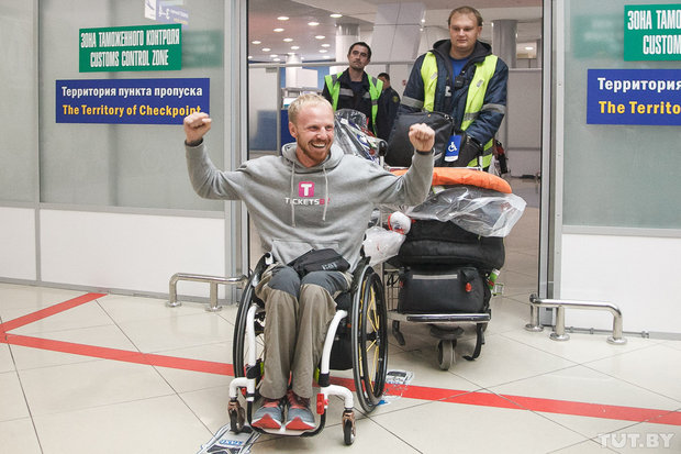 Большой плакат со словами «Саша — молодец!», каравай с цветами и камеры журналистов. Так сегодня в аэропорту встречали Сашу Авдевича — простого парня из Лиды, который захотел — и проехал по 12 странам Европы «на руках». А если точнее — на хендбайке.
