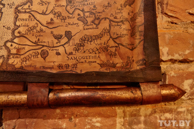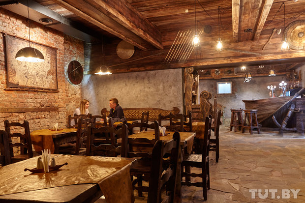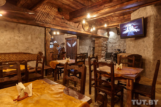 Столы и стулья здесь из натурального дерева. Делали их белорусские мастера, когда-то полюбившие скандинавскую мифологию. На столах лежат «скатерти» из натуральной кожи. Позже к ним присоединятся шкуры животных, которые размесят на спинках стульев.