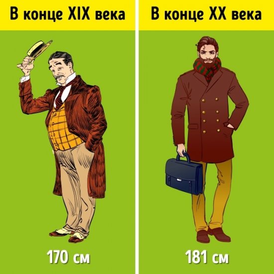 За все время эволюции человека наш средний рост то увеличивался, то становился меньше. Но в целом люди становятся выше. Так за 100 лет, с 1880-х по 1980-е годы, европейские мужчины в среднем стали выше на 11 см.