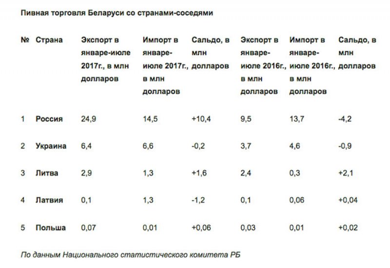 По итогам семи месяцев 2017 года белорусские пивзаводы отгрузили 815 тыс. декалитров пива на сумму 35 млн долларов, тогда как в Беларусь было ввезено 538 тыс. декалитров дал на 25,6 млн долларов. Для сравнения: в этот же период 2016 года экспорт составлял 483 тыс. дал (на 16,3 млн долларов), а импорт – 537 тыс. дал (20,3 млн долларов).