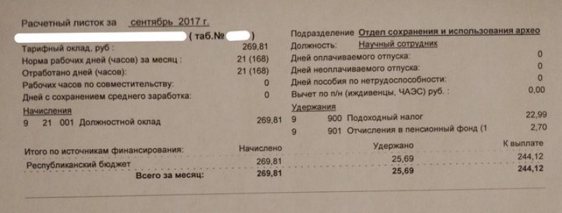 Работник Института истории Академии наук Беларуси Виталий Ашейчик опубликовал в «Фейсбуке» расчетник: зарплата научного сотрудника за сентябрь «на руки» — 244,12 рублей, пишет сайт tut.by.