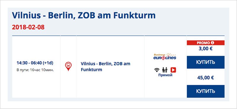 Литовский офис автобусной компании Eurolines до 7 декабря продает билеты на автобусы бизнес-класса до Берлина за 3 евро. Чем не повод устроить себе февральский тур по Европе в компании 50 незнакомых вам людей? Билеты за 3 евро продаются до 7 декабря, а путешествовать по ним можно в феврале.