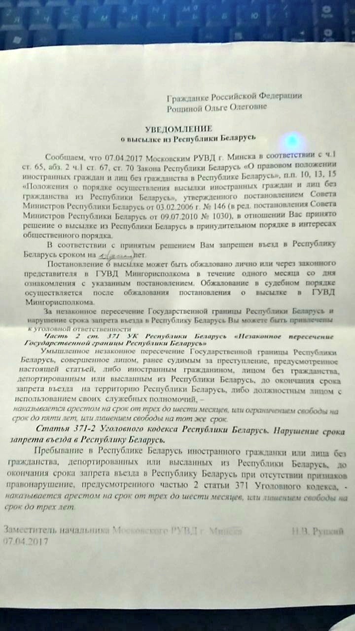 После суток Ольгу должны были депортировать в Россию. Документ о высылке подписан заместителем начальника Московского РОВД Руцкой М.В.